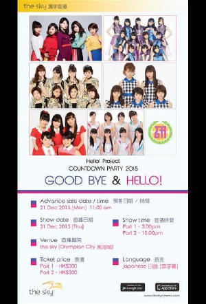 Hello! Project 跨年演唱會連續兩場直播,對2015 say goodbye,向2016 say HELLO! 身為Hello! Project 嘅粉絲們,每年最引頸期待就係跨年演唱會,今年連續轉播兩場,等粉絲們可以同Hello! Project一齊喺戲院告別2015年,邁向新嘅一年,絕對係身為粉絲最開心嘅事! 按照慣例,好多Hello! Project家族藝人都會參與,包括 ℃-ute、Morning Musume.15、ANGERME、Juice=Juice、Country Girls、Kobushi Factory 都會加入演唱會行列!