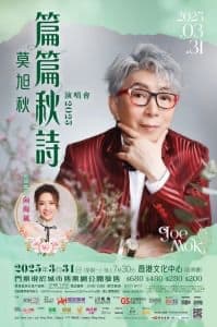 $680/$480/$280/$200 開售日期: 2025年1月7日 上午10時 折扣: (不適用於$A、$C及$E票區) 全日制學生 (九折優惠) 60歲或以上的高齡人士 (九折優惠) 殘疾人士及看護人* (九折優惠) * 顧客每購買一張殘疾人士優惠門票,即可同時以相同優惠購買一張門票予看護人。 莫旭秋 (Joe Mok),國語時代曲名宿張伊雯女士的得意門生,溫文儒雅、氣質謙謙,有「書生歌手」、「情歌王子」之稱。熱愛唱歌的Joe,年少時經常參加校內民歌比賽及一些公開歌唱的比賽,均以無敵的姿態獲獎,而當中以參加無線電視主辦的『聲寶之夜』歌唱比賽,獲得五盞燈滿分而成為一時佳話;踏上歌星之路應是理所當然,惟在70年代後期,Joe選擇繼續繁忙的航空公司工作,而放棄成為歌星的理想,只為了沒有時間練歌,不想辜負欣賞他的朋友。 其後十多年,莫旭秋放下歌唱事業,專注創立自資的旅遊公司業務。打拼在獲得成果的同時,正好配合上90年代中期卡拉OK 大行其道的時期,Joe回歸樂壇並成為幕後代唱紅人,更於94年初嚐擁有個人專輯的滋味,推出首張集廣東、英文及國語歌曲的專輯,廣獲好評。 踏入二千年,莫旭秋成為『懷舊金曲晚會』的中流砥柱,知音人人數不斷遞增,並獲劉鳳屏小姐及尤雅小姐賞識,成為她們的演唱會嘉賓;「銀嗓子」姚莉小姐更親臨觀賞Joe於2007年舉行的個人演唱會,會後還推許Joe為當今國語懷舊金曲接班人,奠定了Joe 在樂壇上的重要地位。 2008年加盟『環星娛樂』之後,嘗試演唱不同風格的歌曲,加上情深款款的演繹,讓他擁有『情歌王子』尊稱。從2010年起,幾乎每一年都會舉行最少一場演唱會,場場爆滿;「秋粉」更會每年自組團隊為Joe慶祝生日,對他熱情擁戴。疫情下,這個每年一會的「約會」,由2020年開始被迫一再延期,【莫旭秋‧秋的懷念世紀金曲演唱會】終於在22年7月與歌迷們再度連線,輕解大家思秋之情緒。23年1連兩場『莫旭秋‧秋情15載金曲回首演唱會』一個人由頭唱到尾絕無冷場,觀眾反應熱烈。 25年3月,莫旭秋篇篇秋詩演唱會2025,誠意邀請到星級嘉賓-向海嵐助陣,感激大家沿途相伴,2025跟你遇上!