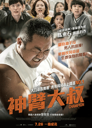 《神臂大叔》開宗明義點出,是受到三十年前史泰龍 Over the top 的啓發,才會以冷門的拗手瓜作為主題。但是導演金容完卻一直避重就輕,把「你死我活、頭破血流」式的熱血決鬥,減省至剛好維持門面程度。當然,任誰也知道,完全不讓馬東石那粗逾一般人小腿的二頭肌露一露臉,是不能原諒、罪莫大焉的暴殄天物。馬東石前作《犯罪都市》故事一般,卻能貨真價實呈現宣傳時所標榜的拳拳到肉。與此相反,《神臂大叔》將東鱗西爪的情節和人物形貌——穿著上Mark哥褸和太陽眼鏡的古惑經理人(有意思的是,馬東石在戲中的英文名字正是阿Mark),熟口熟面的單親媽媽獨力面對黑社會欺壓——拼湊起一個尚算完整的故事。至於所謂的勵志和熱血,只能打一個不及格分數。大約是從 Rocky 開始,有一招讓觀眾血液瞬間沸騰的套路,幾乎成為指定動作。決戰前夕的操練,一定會響起極其激昂的主題曲,然後主角跑街跑山跑沙灘,最後再來一記定了格的振臂狂呼。接下來,積鬱了大半齣戲的怒火,即將山洪暴發!Over the top 說的是一位奔走於美國東西兩岸的長途貨櫃車司機,沿途經過酒吧餐廳等歇腳點,總會與一班同行拗手瓜賭錢。「拗手瓜」是一種身分認同,是代表貨櫃車司機之間的獨特文化。此所以拉斯維加斯舉行的大賽冠軍獎品中,就有一輪超豪華的貨櫃車。片中曾經出現過一兩個極其逼真(懷疑是真)的拗斷手鏡頭,事隔多年依舊歷歷在目非常震撼。在表現拗手瓜驚心動魄、扣人心弦的畫面,以及營造終極對手不可能戰勝觀感上,《神臂大叔》無疑是遠遠不如了。