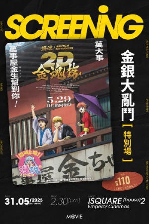 𝗺𝟲 𝘀𝗰𝗿𝗲𝗲𝗻𝗶𝗻𝗴 𝟯𝟴 ➤ 《銀魂劇場版 金魂篇》金銀大亂鬥特別場 日期:2025 年 5 月 31 日 (六) 時間:2 :30 pm 地點:Emperor Cinema iSQUARE (House 2) 票價:$ 110 隨票禮品: 🎁 m6電影收藏卡 🎁 官方貼紙 🎁 官方明信片(一套兩張) 🎁 英皇戲院 on-site food&beverage 10% off(僅限當日使用) 〔 購票注意 〕 ① 電影開始前 1 小時開始派發實體票及禮品。開場後將停止派發。 ② 購票後,如當日未能到場領取禮品,請於 6 月 7 日前將以下資料發送至 [email protected] : ⠿ 購票時所使用的電郵址 ⠿ 購買的座位編號 ⠿ 郵寄資料(姓名+電話+郵寄地址) 我們將安排順豐到付寄送,程序需時約 14-30 個工作天,請耐心等候,逾期恕不補發。 武士之國。人們曾經如此稱呼我們的國家,然而已是昔日往事。20年前,由於突然從宇宙降臨的「天人」崛起以及廢刀令,武士走向沒落。正是在那個時代,一位擁有武士魂的男子出現了。其名為坂田金時。這男人擁有離子燙直金髮與堅定不移的靈魂,經營「萬事屋阿金」。成員有金時、全盤信任他的志村新八,以及個性凶暴但是事事聽從金時的神樂。他們以三人小組完成了許多委託。再加上金時的完美人格和強大影響力,深受歌舞伎町所有人的信賴。正當他們度過一帆風順的日子時,一名自稱「坂田銀時」的天然捲銀髮神秘男子上門。最初他委婉地來提出外遇諮詢,但是他的態度漸漸轉變,針對金時表現出異常的敵意。最後銀時還將萬事屋的成員—蛋蛋和定春,洗腦變成懷舊的顏色,甚至企圖以「懷舊版萬事屋」的名義來搶奪生意。金時他們是否能成功解決這檔麻煩事,並讓歌舞伎町恢復平靜的日子呢——!?