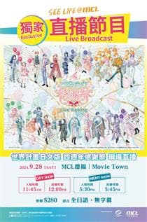 日文版「世界計畫」四週年紀念感謝祭即將登場! 2024年9月28日(六)在橫濱BUNTAI(神奈川縣)舉辦的「日文版世界計畫四週年感謝祭」日場・夜場公演,兩日共四場公演為大家帶來朗讀劇、Talk Show及小型LIVE SHOW等特別舞台,將在MCL德福戲院及Movie Town進行直播! 深受年輕人喜愛的Android/iOS系統手遊「世界計畫 繽紛舞台!feat. 初音未來」,為紀念世界計畫四週年,今年也將推出豪華出演陣容,舉辦線下舞台活動「日文版世界計畫四週年感謝祭」。屆時將有原創劇本現場朗讀劇、世界計畫四週年的歷程回顧訪談、歷年都大受好評的小型LIVE等感謝祭特有的精彩內容! 如此特別的感謝祭將設日、夜兩場公演,並將在MCL德福戲院及Movie Town舉行現場直播。 讓我們在MCL德福戲院及Movie Town一起慶祝世界計畫四週年吧! 【聲優陣容】 野口 瑠璃子(飾 星乃 一歌)、礒部 花凜(飾 天馬 咲希)、中島 由貴(飾 日野森 志步) 小倉 唯(飾 花里 實乃里)、吉岡 茉祐(飾 桐谷 遙)、本泉 莉奈(飾 日野森 雫)、秋奈(飾 小豆澤 心羽) 鷲見 友美ジェナ(飾 白石 杏)、今井 文也(飾 東雲 彰人)、伊東 健人(飾 青柳 冬彌) 廣瀬 大介(飾 天馬 司)、Machico(飾 草薙 寧寧)、土岐 隼一(飾 神代 類) 田辺 留依(飾 朝比奈 真冬)、鈴木 みのり(飾 東雲 繪名)、佐藤 日向(飾 曉山 瑞希) 備註: - 入場觀眾均可免費獲得官方限定特典(日間公演與夜間公演之現場直播特典為同款。) - 請參閱Live Viewing Japan官方網站頁面,以了解是次直播節目的注意事項。