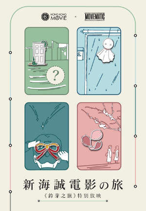 MOVIE6 x Moviematic 有新搞作!今次為大家準備咗新海誠電影之旅,以新海誠作品嘅小物貫穿旅程,最後以《鈴芽之旅》作為終點!觀眾除咗可以優先於上映之前欣賞電影,更會得到MOVIE6 x Moviematic 特地準備嘅特製襟章,一套五款,套票將隨機派發襟章一個,如果想集整一套五款,即場可以去放映當日嘅付費扭蛋專區抽齊五個襟章,將佢地pin落我地嘅特製戲飛到留個記念! 《你的名字。》新海誠監督最新奇幻作!居住在九州的靜謐村莊的17歲少女‧鈴芽,與「正在尋找門扉」的青年‧草太相遇。鈴芽追隨草太來到山中廢墟,發現一道陳舊門扉,而門扉似乎有一股神秘力量,吸引鈴芽向它伸出手… 不久,神秘門扉相繼在日本各地出現。而為了阻止災害從門的另一邊竄出,這些門扉必須被鎖上。在神秘門扉的引導下,鈴芽環遊日本將門上鎖的旅程將要展開…
