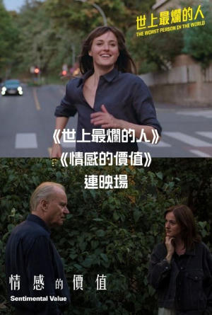 由青年的身份迷茫到原生家庭創傷,見證金像提名導演約謙特艾爾與康城影后溫娜特雲絲薇的成長之路。 兩部電影之間有15分鐘休息時間,觀眾離座後須憑票尾再入場。 《世上最爛的人》 即將滿30歲的茱莉,與大部分當代年輕人一樣,人生總是一團糟,嚮往自由是她的首要價值,而這份自由卻又帶來迷茫。她因為成績好而選擇讀醫,順從衝動轉系又重讀,偶爾想到就寫寫文章,一時興起便拿起相機當攝影師,最終放棄一身好才華,跑到書店當店員。「世上最爛的人」或許也是這一代人的縮影:不安現狀,仍在摸索未來。茱莉的當紅漫畫家男友艾索一直希望和她生小孩組織家庭,逼得太緊反而弄巧成拙。偶然之下她闖進一個派對,邂逅年輕迷人的小鮮肉亞文。很快地,她頭也不回陷入另一段新戀情,渴望帶來新轉變。隨著日子繼續前進,衝動和遺憾卻不斷發生在茱莉身上,以為找到靈魂伴侶共度一生,到頭來還是自己一個更開心? 導演:約謙特艾爾 時長:127分鐘 主演:溫娜特雲絲薇、安德斯丹尼爾辛李、赫伯特諾德姆 級數:III 語言:挪威語 (中文、英文字幕) 《情感的價值》 榮獲康城影展評審團大獎、金球獎最佳男配角及奧斯卡9項提名,《世上最爛的人》導演約謙特艾爾與康城影后溫娜特雲絲薇再度攜手,細膩探尋一個家庭的疏離、和解與救贖。羅娜是奧斯陸舞台劇演員,總與身邊人若即若離,唯有妹妹安妮絲是最親近的依靠。電影名導父親古斯塔夫多年前拋下家庭出走後,便在這個家留下了無法癒合的裂痕。當母親離世,古斯塔夫重新闖入兩姊妹的生活,更邀請羅娜主演他寄予厚望的復出之作,觸動了眾人心中極力掩藏的傷疤。父女之間封存已久的感情開始翻湧——即使缺席了彼此大半人生,這最後的作品能否給予對方一生的情感價值? 導演︰約謙特艾爾 片長︰133分鐘 演員︰溫娜特雲絲薇、施達倫沙士格、英加伊布斯多特莉莉亞斯、艾麗芬寧 級數︰IIA 語言︰挪威語、英語、瑞典語(中文、英文字幕)