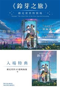 《你的名字。》新海誠監督最新奇幻作!居住在九州的靜謐村莊的17歲少女‧鈴芽,與「正在尋找門扉」的青年‧草太相遇。鈴芽追隨草太來到山中廢墟,發現一道陳舊門扉,而門扉似乎有一股神秘力量,吸引鈴芽向它伸出手… 不久,神秘門扉相繼在日本各地出現。而為了阻止災害從門的另一邊竄出,這些門扉必須被鎖上。在神秘門扉的引導下,鈴芽環遊日本將門上鎖的旅程將要展開… 凡購買指定《鈴芽之旅》踏足常世特別場戲票乙張,即可於入場時憑票獲贈【踏足常世A3透明海報 一張】。數量有限,滿座即止。