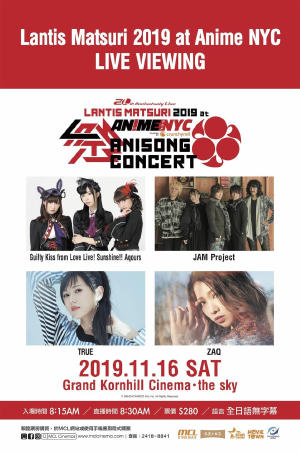 在紐約最大的日本流行文化展覽裡舉辦的「Lantis Matsuri at Anime NYC」 將於the sky舉辦現場直播!為紀念Lantis創立20週年,BANDAI NAMCO Arts在6月於幕張Messe展示場舉辦了3天的「Lantis Matsuri」,總共來場人數達5萬人。「Lantis Matsuri」將於Anime NYC舉辦紐約公演。Guilty Kiss from Love Live! Sunshine!! Aqours、JAM Project、ZAQ、 TRUE這4組呈獻的豪華演唱會將在the sky現場直播! 難得能透過現場直播一睹紐約公演的熱鬧氣氛,大家千萬不要錯過這珍貴的機會!